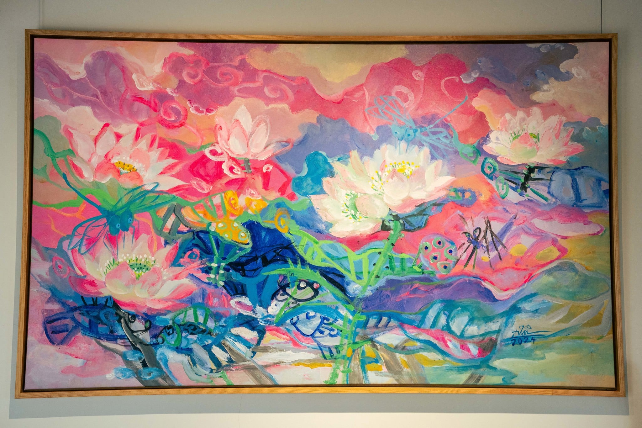 “The Lotus” is a striking acrylic painting by Vietnamese artist Ngô Thị Bình Nhi, capturing the vibrant essence of Vietnam’s national flower. Measuring 2.1m x 1.3m, the artwork is a powerful visual journey through color, movement, and symbolism.